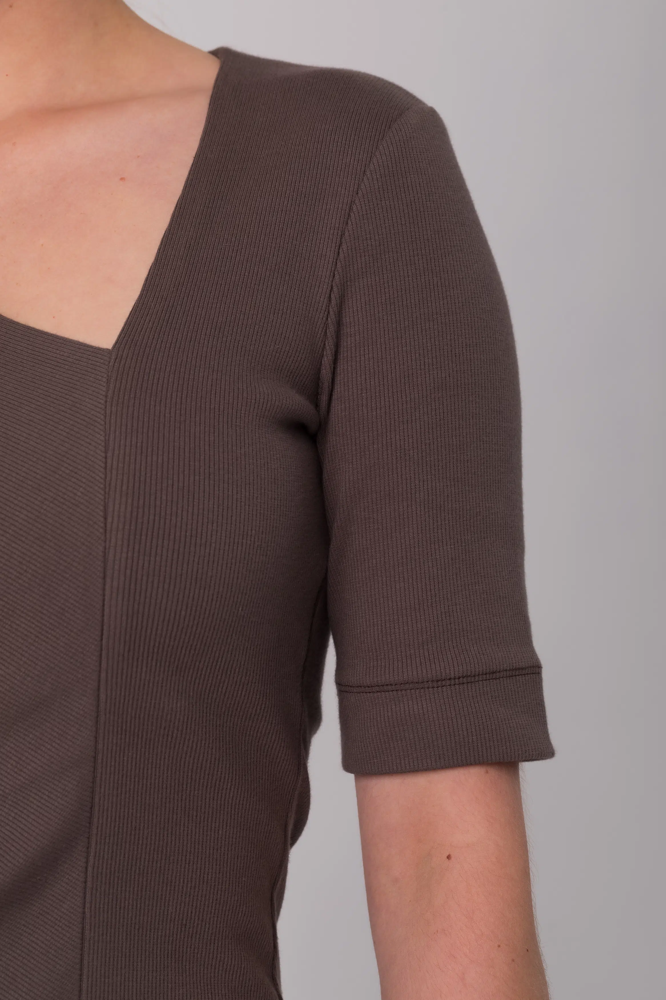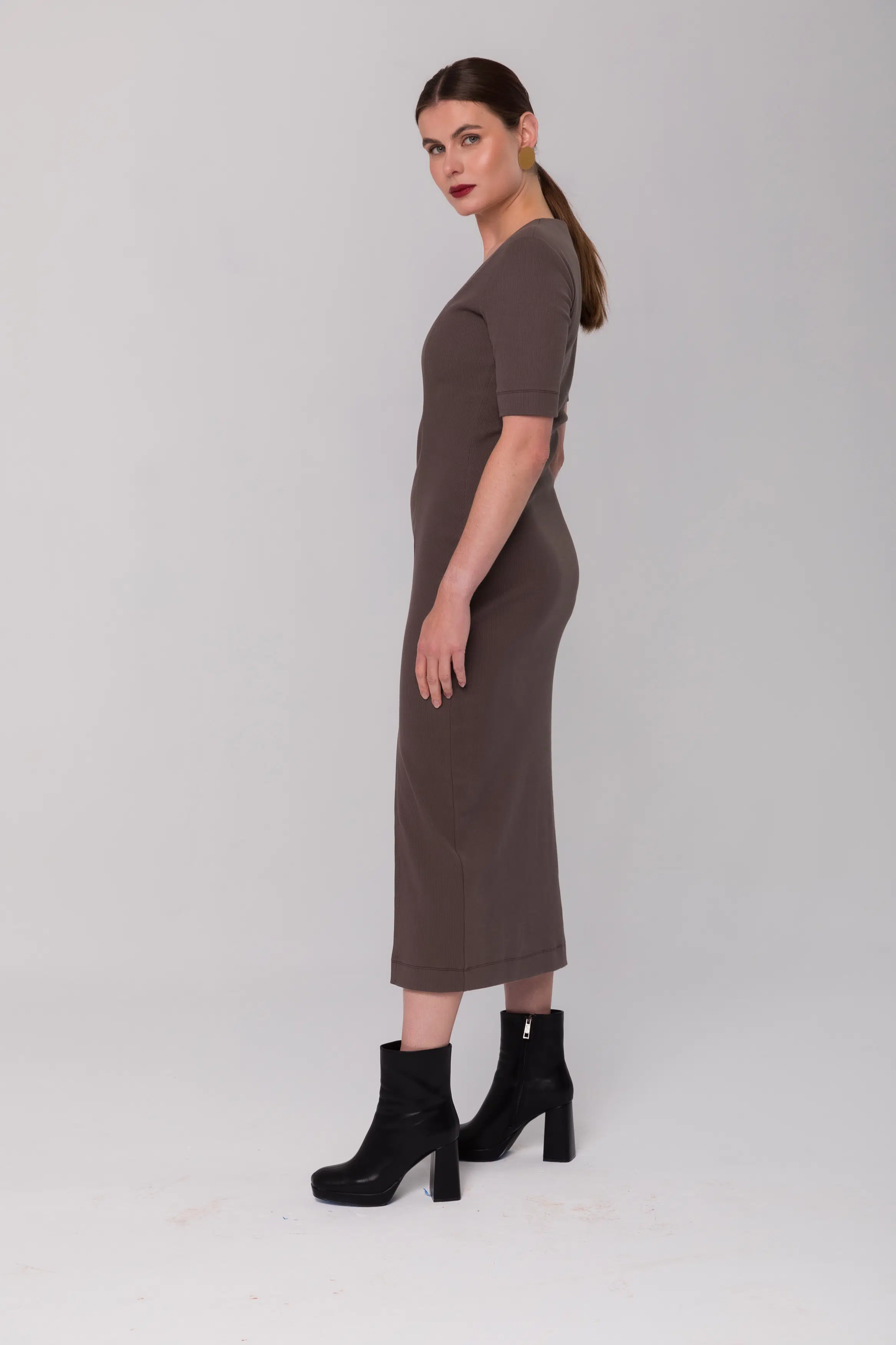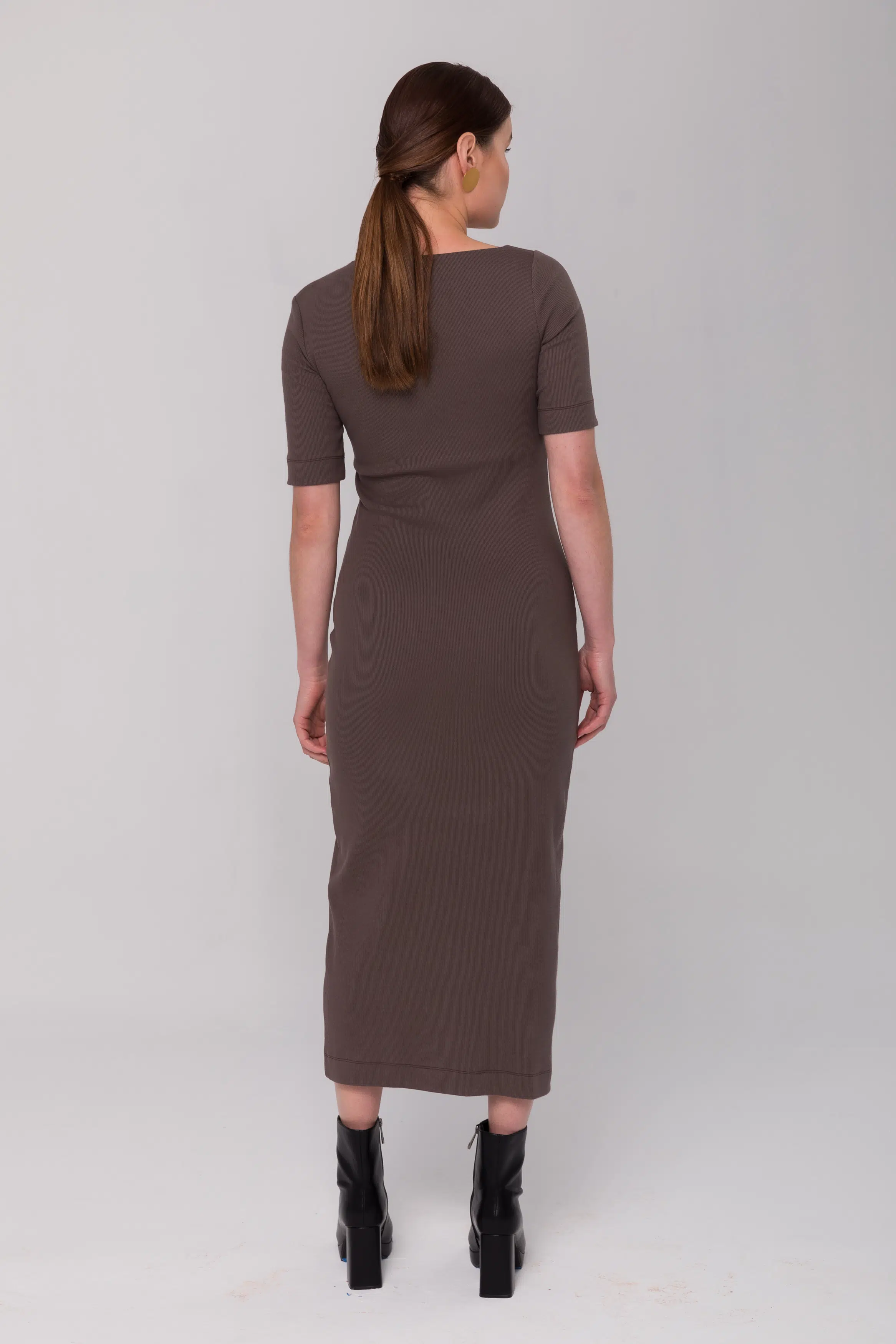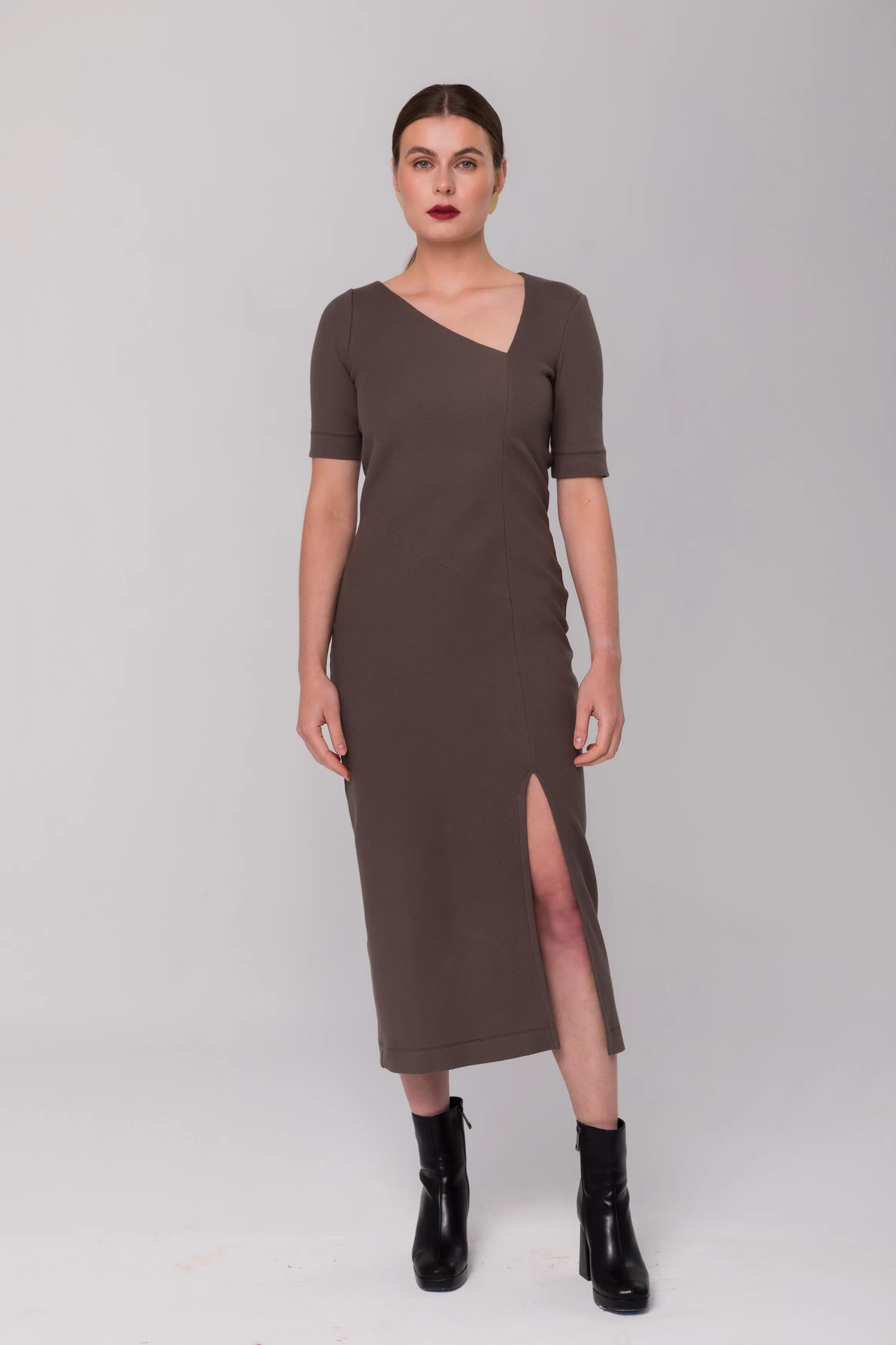 Dopasowana, długa sukienka z krótkim rękawem i asymetrycznym dekoltem uszyta z prążkowanej dzianiny.